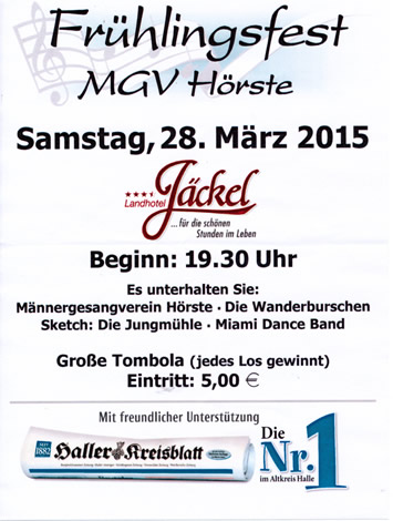 | am 28.03.2015 feiern wir unser alljähliches Frühlingsfest. Hierzu laden wir alle Freunde und Förderer des MGV-Hörste herzlich ein. | ||