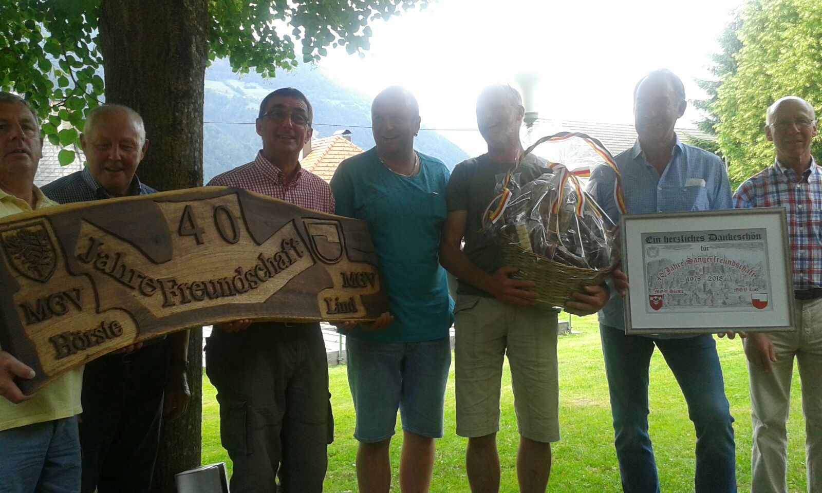 Wo nun die Frühjahrsaktivitäten den MGV-Hörste vorbei sind und wir unseren Freunden des MGV-Hörste hoffentlich eine schöne Stunden haben geben können, sind wir z.Zt. in einem ruhigeren "Fahrwasser" was die Auftritte betrifft.Wir sind aber einer Einladung unseren befreundeten Männerchor aus Kleblach/Lind gefolgt, und haben an einem Kranzelsingen teilgenommen. Gleichzeitig wurde die "40-jährige" Freundschaft besiegelt. Denn beide Chöre feiern in diesem Jahr ihr 120-jähriges bestehen. |