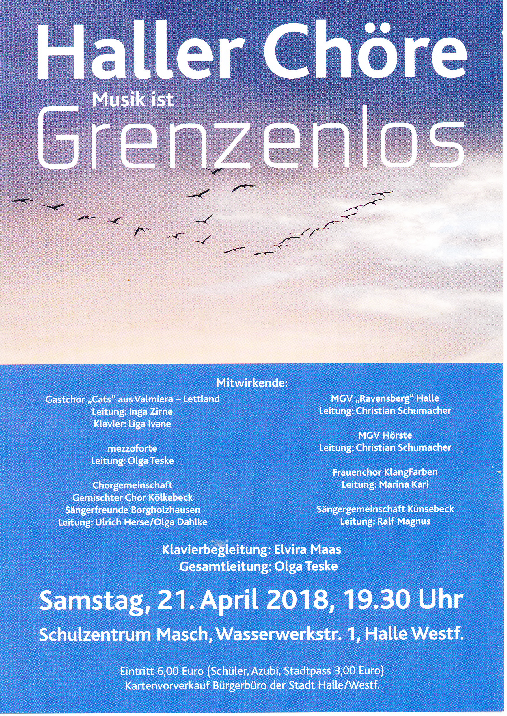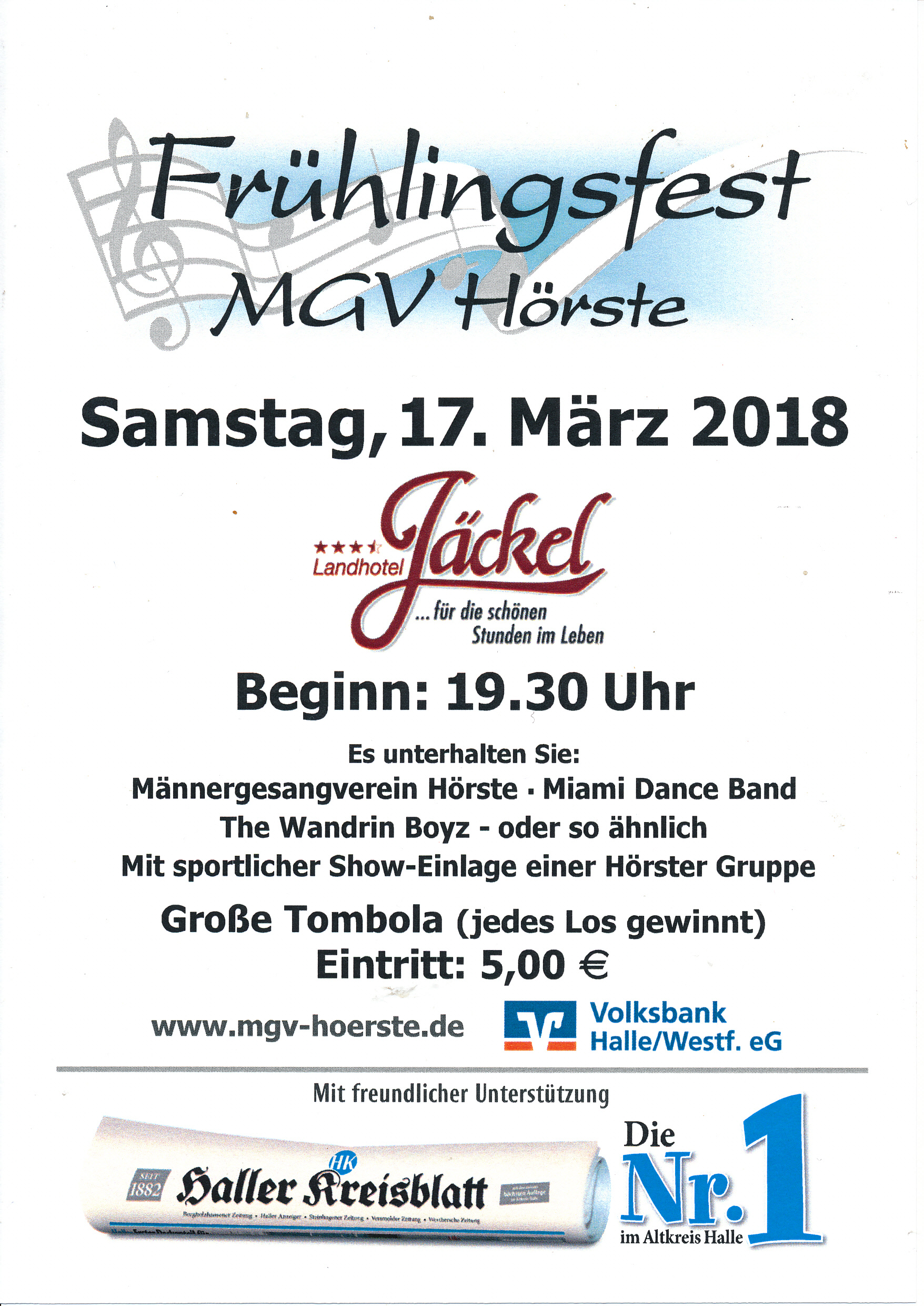 Nachdem im März unser Frühlingsfest erfolgreich hinter uns liegt (siehe Presseberichte), und Ostern auch vorbei ist, steht nun der nächste musikalische Höhepunkt im Haller Sängerkreis an. Das Konzert Haller Chöre, wo sich neben dem MGV-Hörste auch noch andere Chöre presentieren. (siehe Flyer und Programm) |