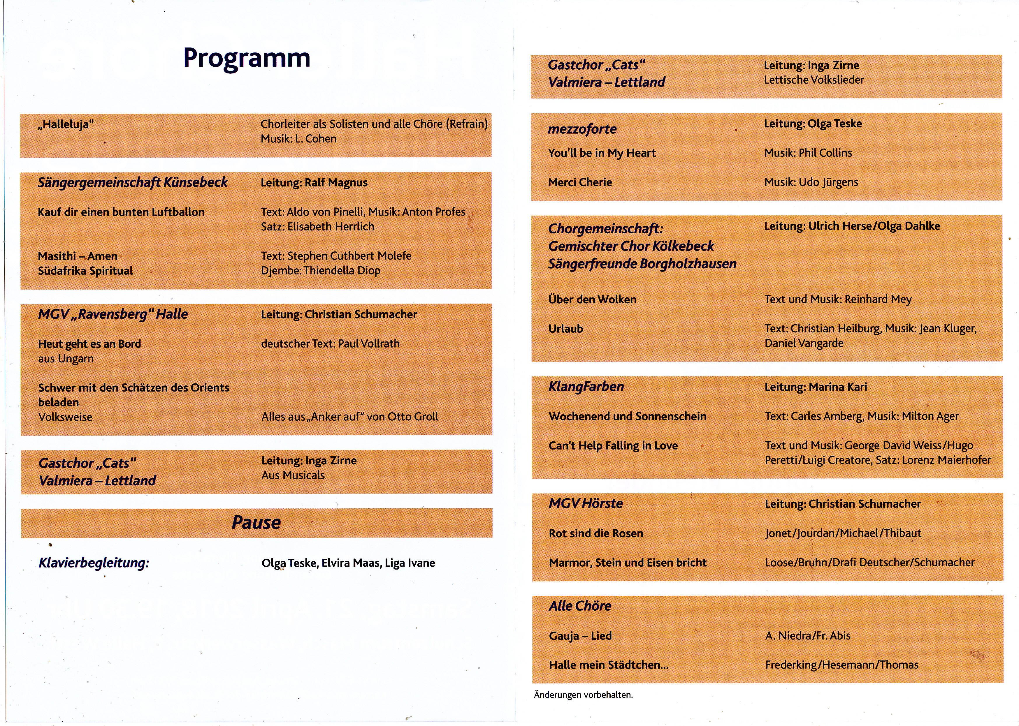 | auch wenn in diesem Jahr der Ort sich geändert hat, (Aula Halle Masch) so wird sich an der Klasse des Anspruchs der Darbietungen nichts ändern. Allen Freunden des Chorgesangs wird wieder ein bezaubender musikalischer Abend geboten. | ||
